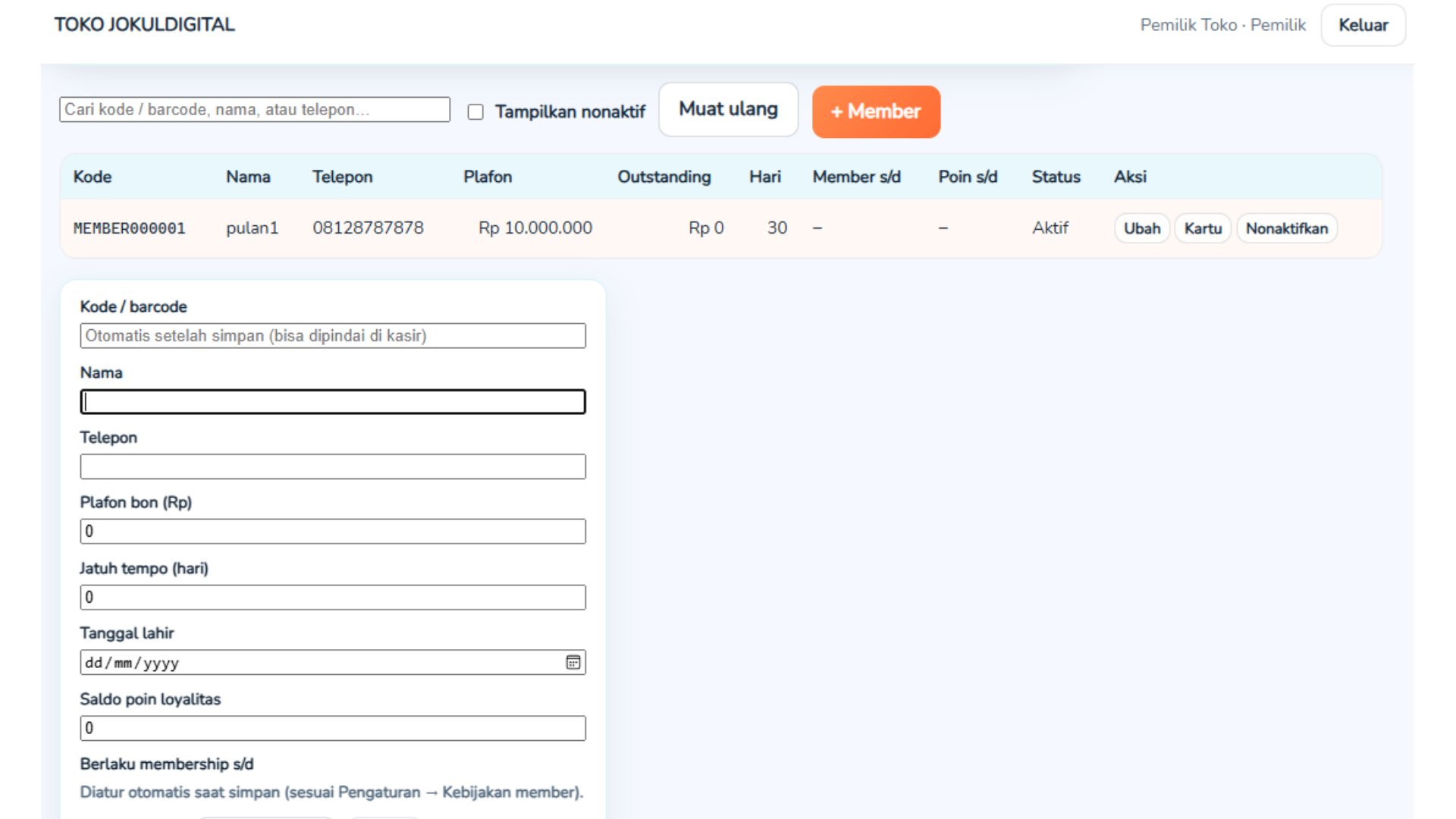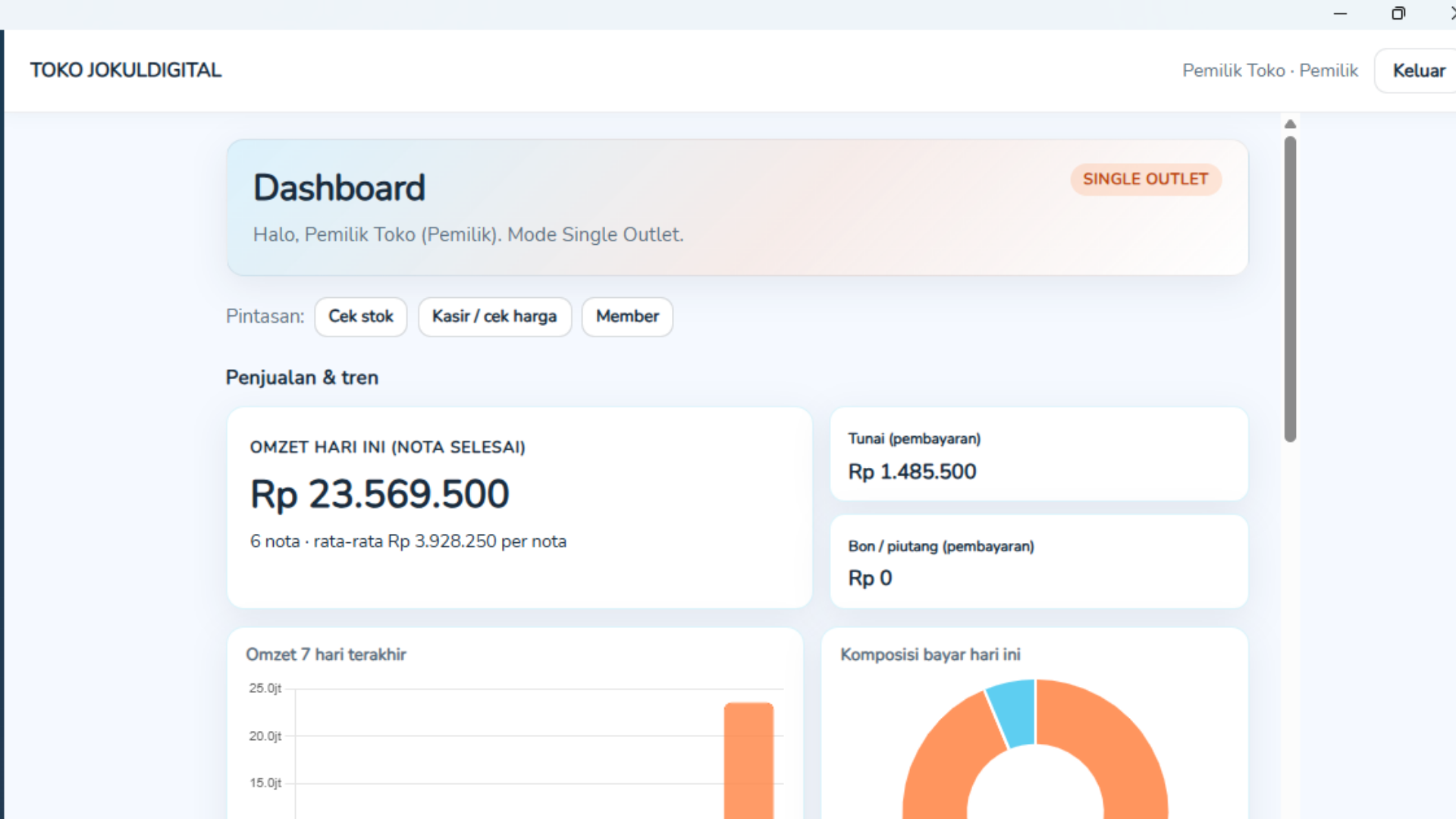 Pengguna dan peran (pemilik, admin, kasir, dan seterusnya sesuai aturan aplikasi)