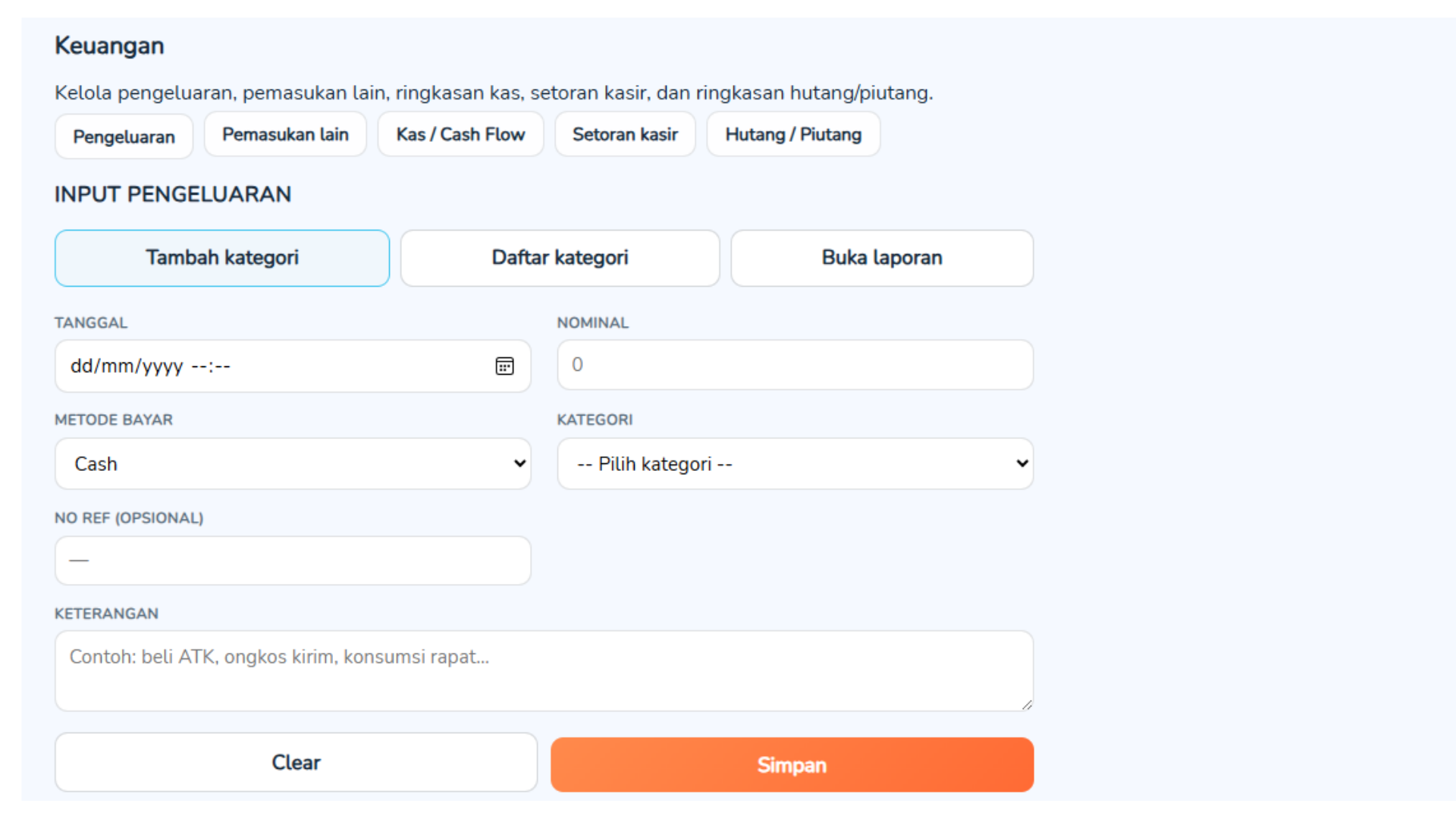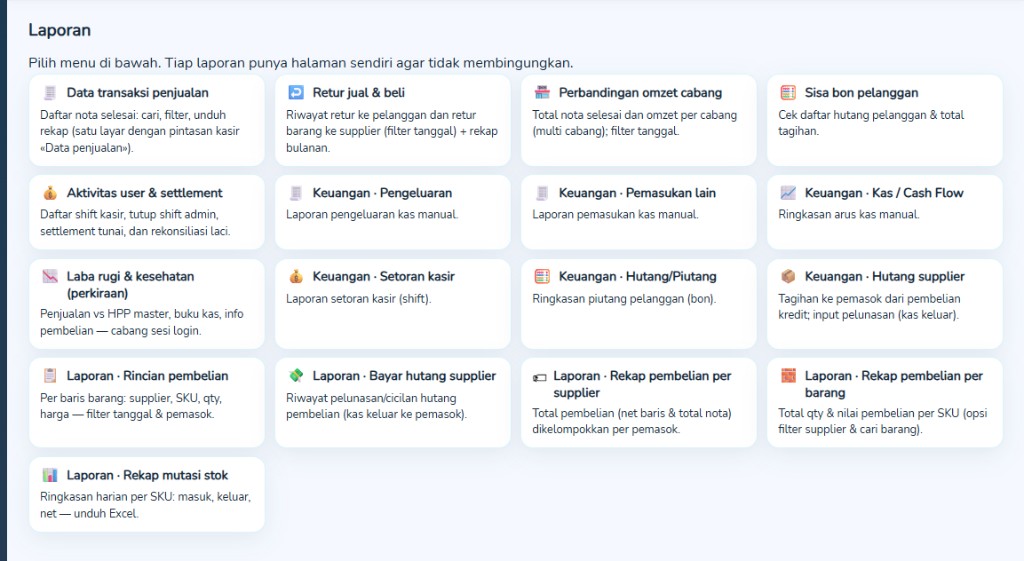 Laporan: penjualan, keuangan (pengeluaran/pemasukan), laba rugi perkiraan, pembelian, mutasi stok, multi cabang (jika dipakai), aktivitas kasir & settlement, dan lainnya — banyak mendukung ekspor/unduh
